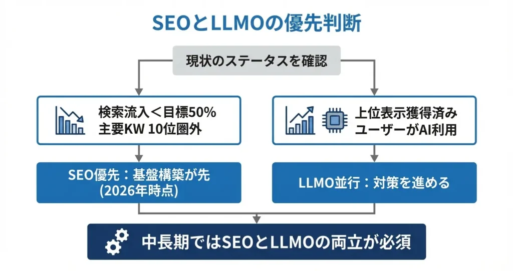 実務的には、まずSEOで基盤を固め、その過程で作成したコンテンツをLLMOの観点から見直すという段階的なアプローチが現実的です。