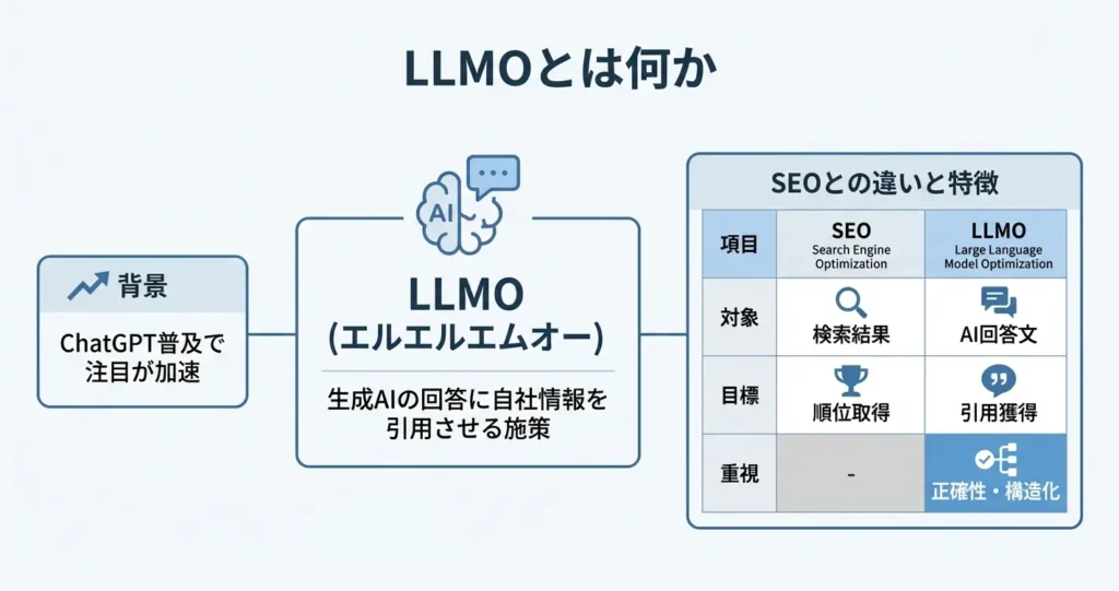 このセクションでは、LLMOの定義と注目される背景、そして最適化の対象が何であるかを整理します。