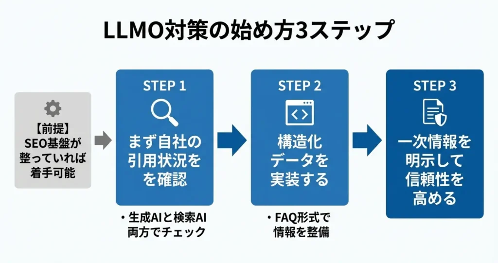 ここでは、LLMO対策を始める際に最初に取り組むべき内容を、確認方法・具体的な施策・サポート体制の3つの観点から整理します。いずれも特別なツールや予算がなくても着手できる内容です。