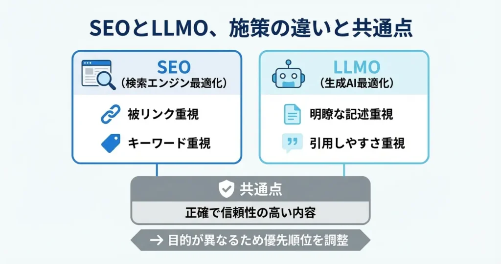 なお、SEOとLLMOは対立する概念ではなく、多くの場合は併用して取り組むものです。