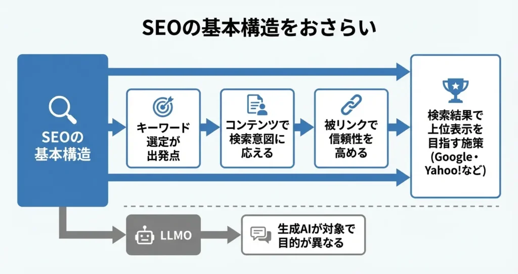 SEOが従来の検索エンジンを対象とするのに対し、LLMOは生成AIを対象とする点で根本的に異なります。この違いを正しく理解するために、まずSEOの基本構造を確認しておきましょう。