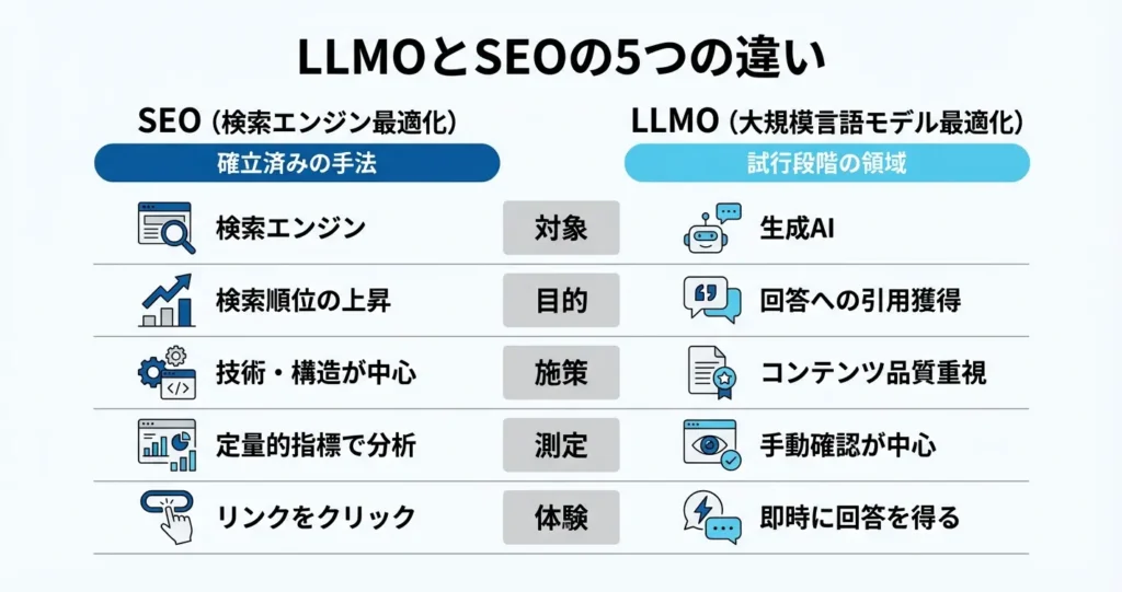 LLMOの概念を理解したところで、次に気になるのは「SEOとは具体的に何が違うのか」という点です。