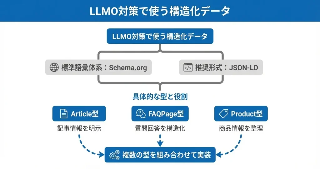 LLMO対策では、Schema.orgの語彙をJSON-LD形式で実装し、コンテンツに応じてArticle・FAQPage・Productなどの型を選択することが基本となる