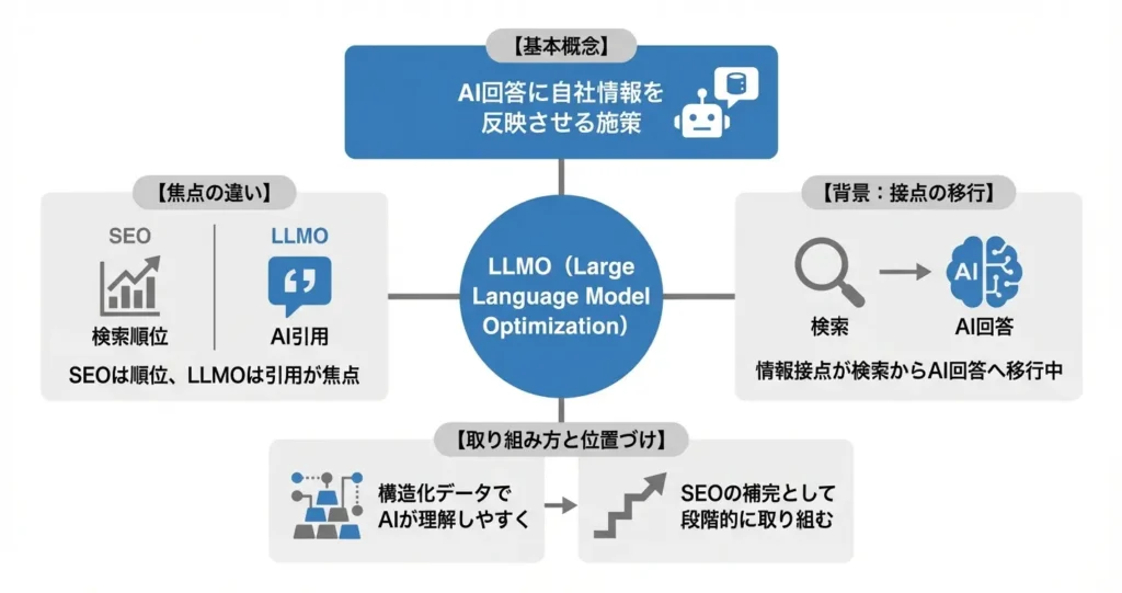 LLMOは、Large Language Model Optimizationの略称であり、大規模言語モデルによる情報生成の過程で、自社コンテンツが参照されやすくする取り組み全般を意味します。
