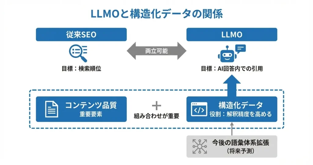 ここではこれまでの内容を踏まえ、両者の関係性を全体像として整理し、従来のSEOとの違いや今後の展望を確認します。この整理によって、LLMO対策における構造化データの位置づけが明確になります。