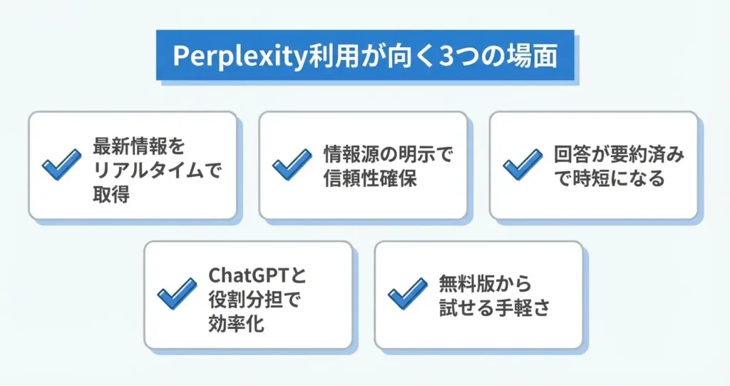 Perplexityは、情報の出所を確認しながら効率的に答えを得たい場面で活用される傾向があります。特に、ニュースや統計データなど最新情報が必要な調査、複数の情報源を比較検討したいリサーチ、専門的なトピックについて概要を素早く把握したい場面などで利用されています。