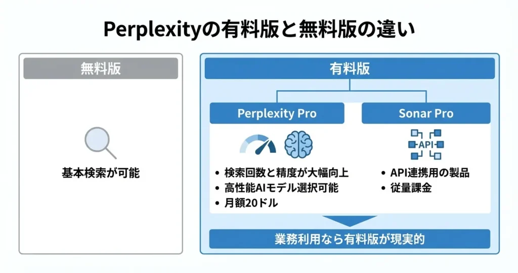 無料版と有料版が提供されており、無料版では基本的な検索機能と標準的な言語モデルを利用できます。有料版では、GPT-4oやClaudeなどより高性能なモデルの選択、1日あたりのPro検索回数の大幅増加、ファイルアップロード機能などが追加される仕組みです。