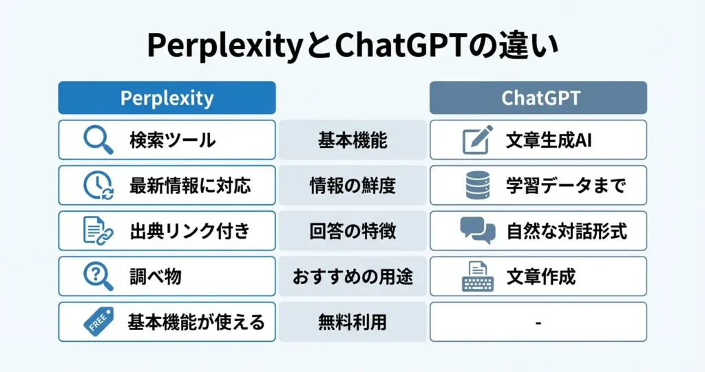 ChatGPTが学習済みの知識をもとに回答するのに対し、Perplexityは質問のたびにインターネット上の最新情報を参照して回答を生成する点が最も大きな違いといえます。