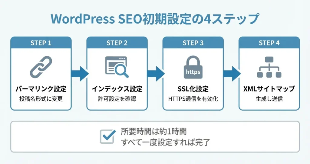 WordPressをインストールしたら、まず取り組むべきSEO設定があります。これらは一度設定すれば完了するもので、コンテンツ作成の前に必ず済ませておく必要があります。