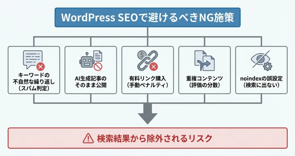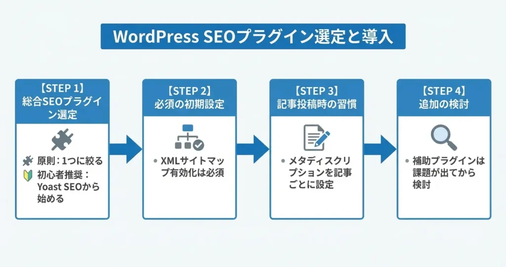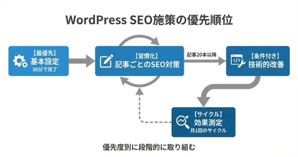 SEO施策は多岐にわたるため、すべてを同時に進めることは現実的ではありません。このセクションでは、WordPress特有のSEO施策を優先度別に整理し、初心者が迷わず取り組める順序を明確にします。