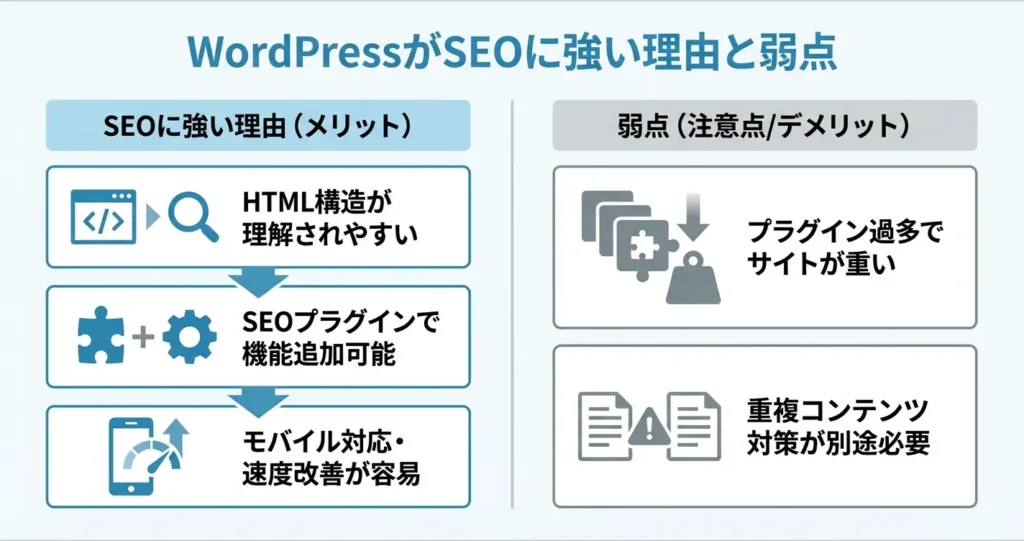 このセクションでは、WordPressがSEO施策を実施しやすい理由と、その一方で注意すべき弱点について整理します。これらを理解することで、正しい方向性で施策に取り組むための土台を築くことができます。