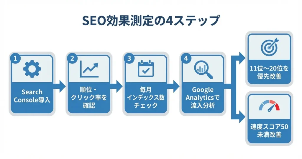 この後に取り組むべき施策として、記事ごとのタイトル・メタディスクリプション最適化、内部リンク構造の整備、画像の最適化、ページ表示速度の改善などがあります。しかし、それらはすべてこの初期設定が完了していることを前提としています。