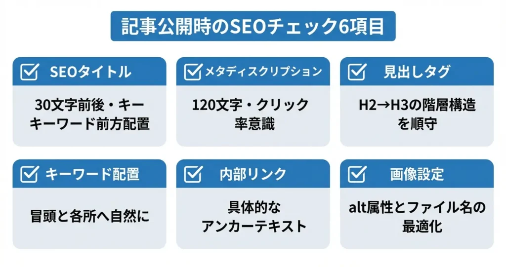 これらは記事の執筆と公開の流れの中で自然に実施できるものであり、記事ごとに積み重ねることでサイト全体の評価が向上していきます。